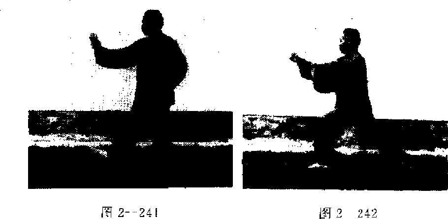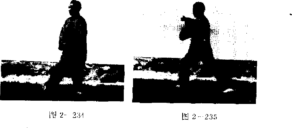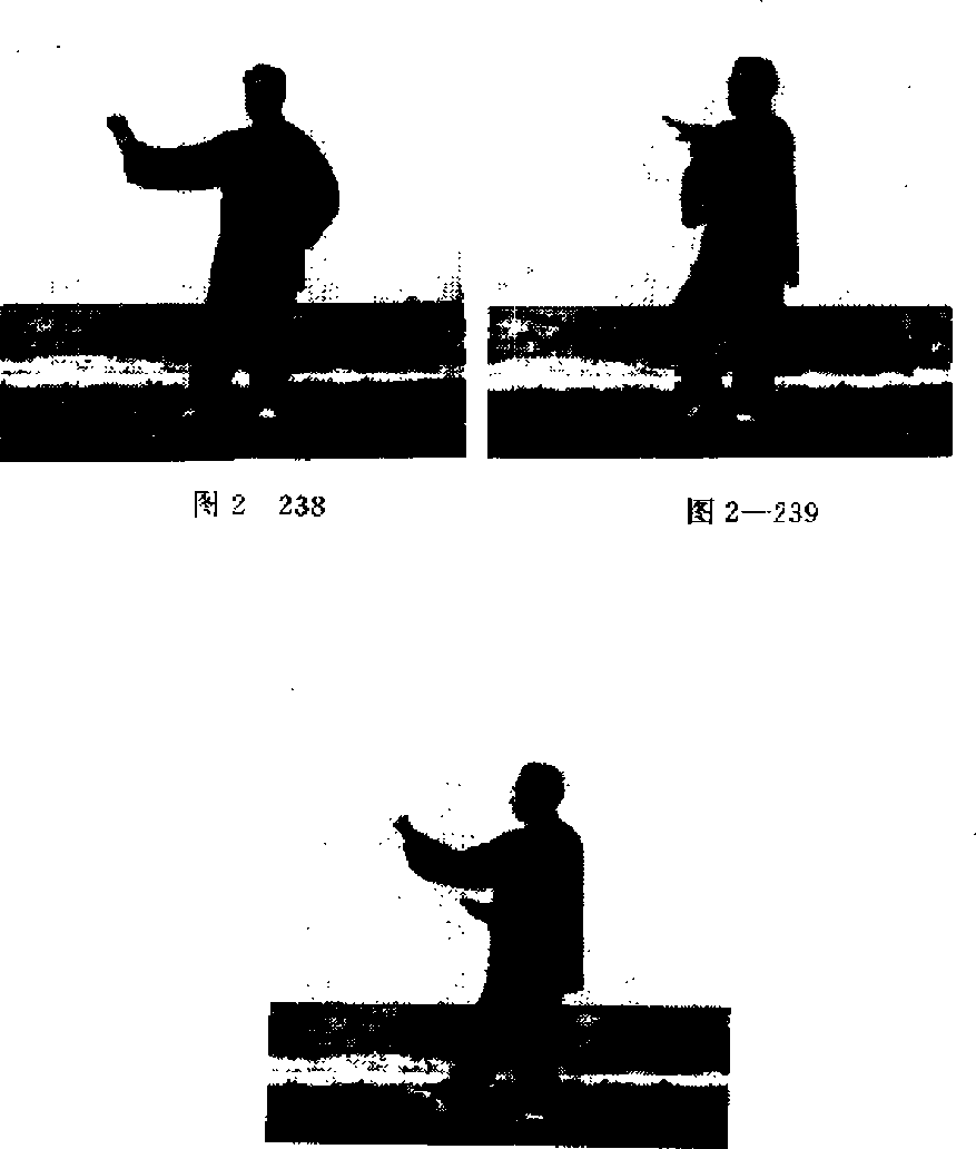 穿吕.再向心前方抹掌,苹心向前下方;眼随右掌转动,最应 视前方(图237)