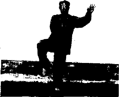 右小腿随摆动结束屈膝回收,厶脚提于身体右侧,大腿抬 _,小腿垂直,脚尖自然下垂;左脚微屈自然站立成独立步, 体正直并向左稍转体;两苹拍脚后继续随惯性左摆,左掌摆甲 左肩外侧,掌心朝斜前方,腕高与肩 ;右掌摆罕左肩前,掌心 向左?掌指与肩视左肀,〈图2—233)