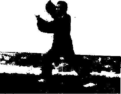 右脚向右侧落卜,脚跟先着地,随上体的右转和身体重心 的右移而全脚箏踏实;右腿屈膝,左腿自然后歴伸直成右弓 步,体微向前倾;两掌同时下落,再向右、向右上划立圆.至 身体在侧时两常变握桊;左举拳心向卜拳服向内.右拳拳心 向外,拳眼斜向下;视前方3 (.阁2—23.235)