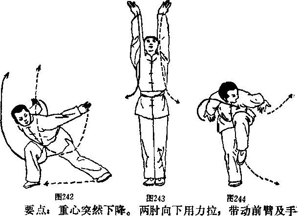 上动稍停。突然含胸、收腹、敛臀、屈右腿、提左膝; 同时两肘领先,向下(使两臂由直到屈再到直)经胯侧向后 掸手,至身后两侧,手、朝下。目视左方。(图244)快速向下,要小指侧掸擦腿外侧,击出声响,力点在手背 上。