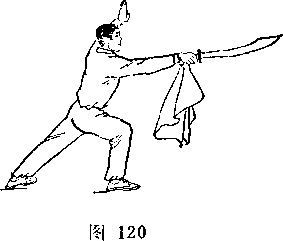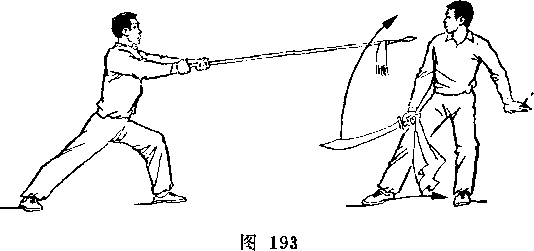 甲右腿屈膝前弓;右手握刀,向前扎乙左肋,刀尖朝前,刀刃朝下;目视刀(图255)。
