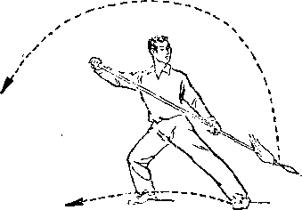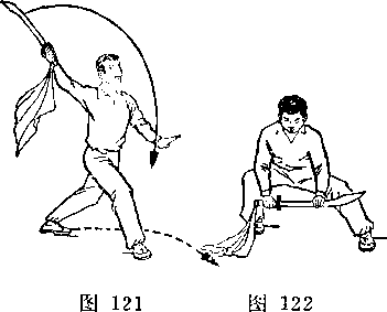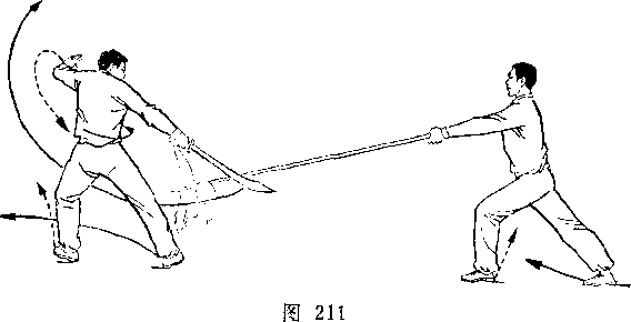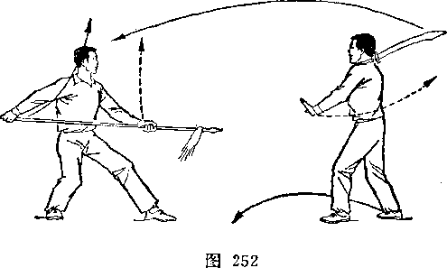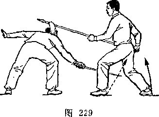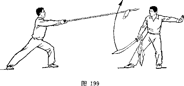 甲左脚向前半步,右臂外旋,刀尖向后、向右平绕半周,刀刃朝前,刀尖朝右后方,举于右上方,? H视乙。乙右腿全蹲,左腿伸直,成左仆步;两手握枪,由左向后向右下抡转一周,横扫甲两腿;枪杆与地面平行,目视甲(图239)。