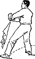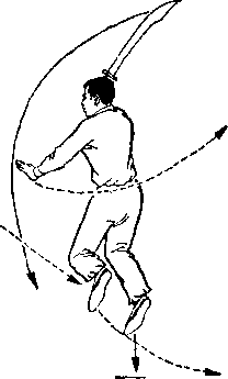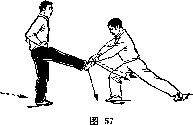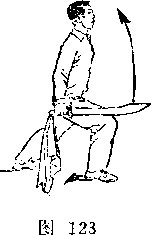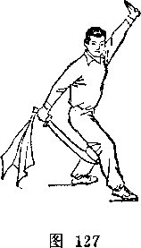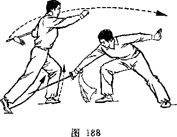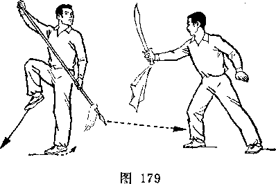 旋,使刀顺乙绞把之势向左、向下划弧,随即右前臂继续内旋, 使刀身与地面成平行,刀刃翻转向右,横扫乙两腿,同时左手平 举于体左侧;目视刀(图258)。