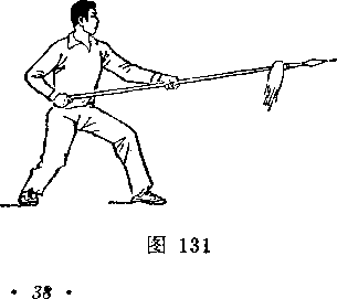 乙身体左转,两腿微屈,右脚跟提起,体重偏于左腿;同时右手握把端,向左前方推出,枪杆竖直,枪尖向上,格挡甲刀;目视甲刀(图256)。