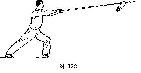 乙左腿屈膝成左弓步;两手握枪向前上方扎甲头部右 侧,?目视枪尖(图243)。