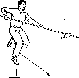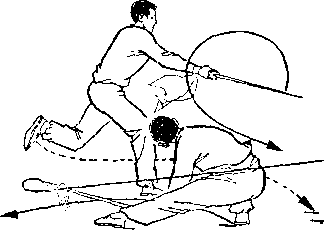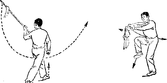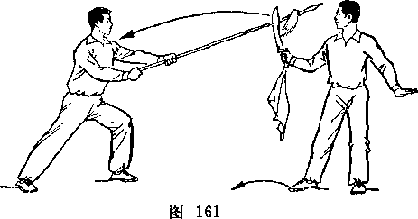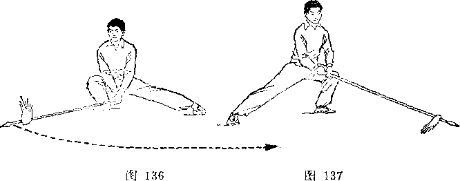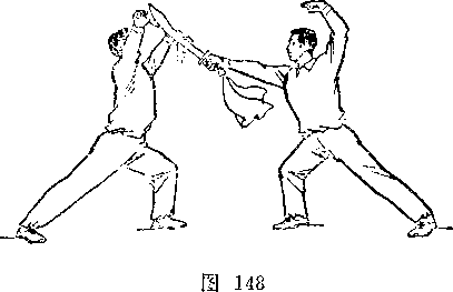 甲持刀继续右扫。乙两手握枪由甲体前划弧下落;两脚 落地,两腿屈膝微蹲,?目视甲(图267)。