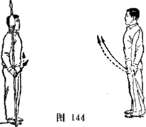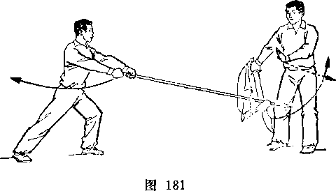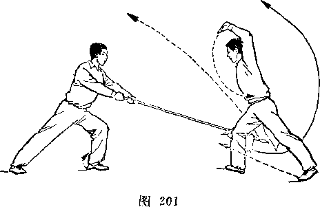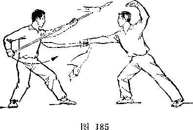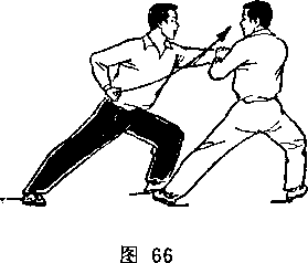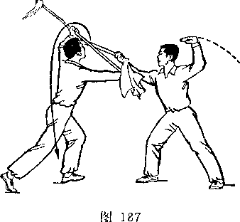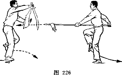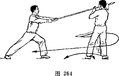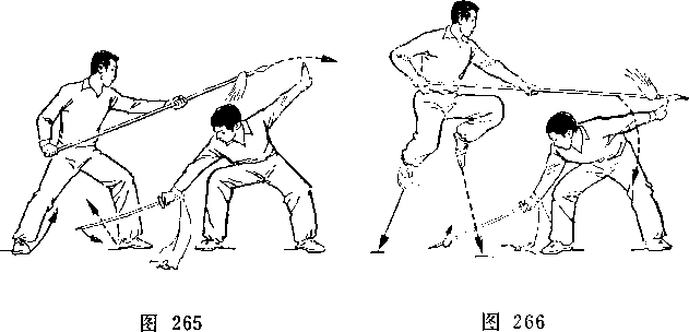 (2)乙两脚蹬地跳起;同时枪身由左向右划弧横击甲头部; 目视甲(图266)。