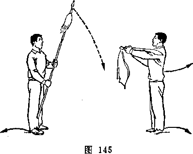 下落:目视乙。乙重心后移,两腿微屈;右手向后抽枪,左手滑握枪前段,枪杆平置于腰前;目视甲(图252)。