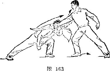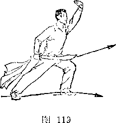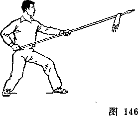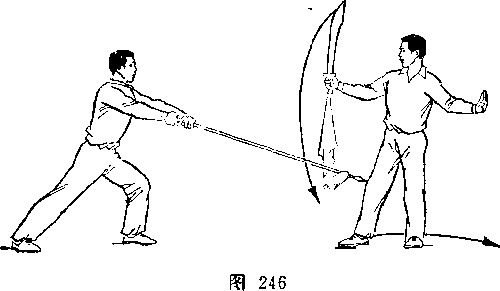 (2)乙左腿屈膝成左弓步;两手握枪向前下方扎甲右腿;目 视枪尖(图246)。