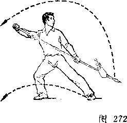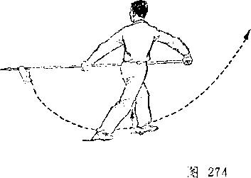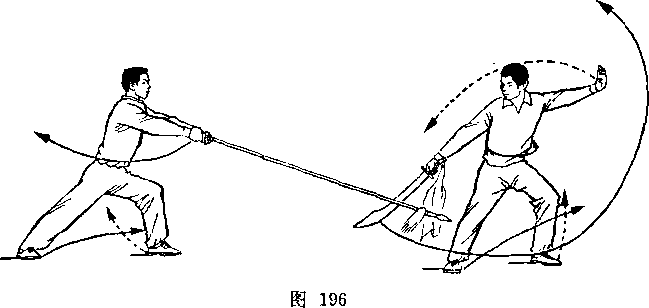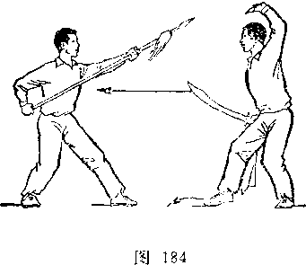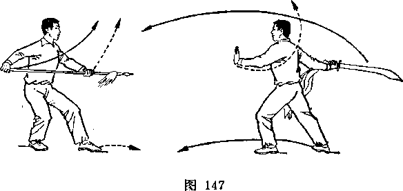 甲以右脚为轴,左腿屈滕提起,身体向右后转,?右手握 刀随体转;目视刀。乙右后转体,左脚向前一步,左膝微屈,?两 手握枪,枪尖由左下方向上摆起,随体转向前划弧, ?同时右手滑 握枪中段,经腹前向左腋下绕行;目视枪尖(图273)。