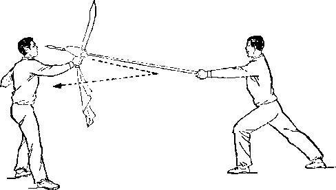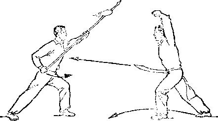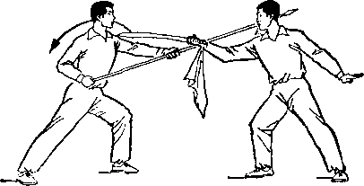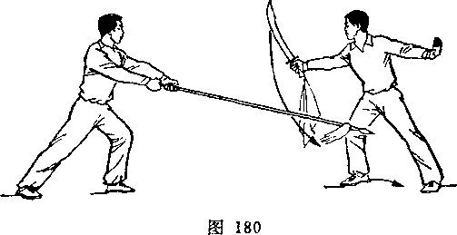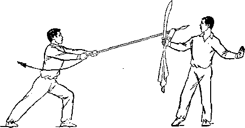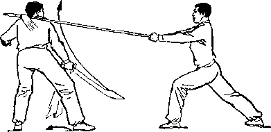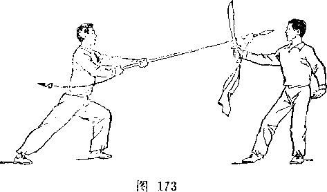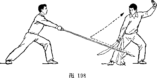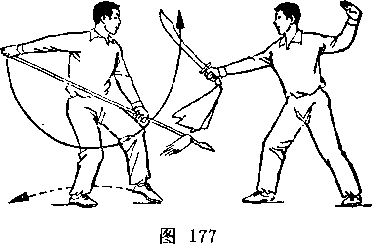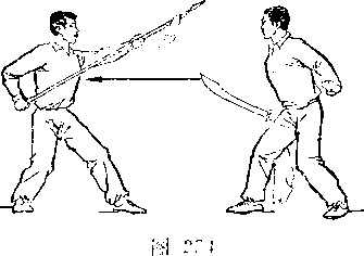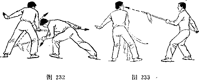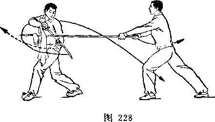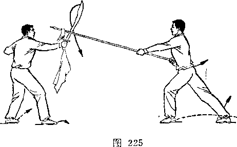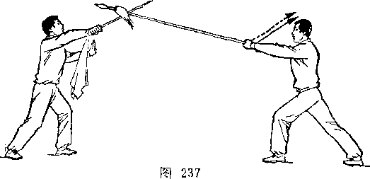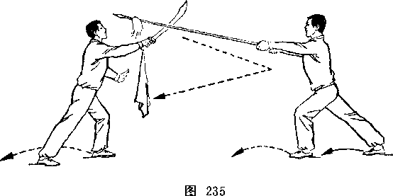 乙右手将枪抽回,随即左脚上半步,右脚跟进半步,仍成左 弓步,?两手持枪向前平扎甲腹部;目视枪尖。甲左脚后撤一步, 右臂内旋,右手提刀,刀身横平下按乙枪;左手附于右腕内恻; 目视乙(图236)。