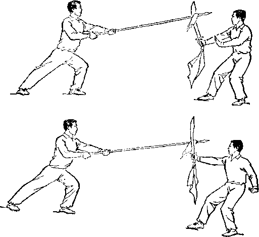 甲右手持刀,沿乙两脚下向右扫过,随即抬头直身;目视乙。乙两手持枪向右沿甲身前弧形下落,两脚落地,两腿屈膝;目视甲。甲右臂外旋,右手持刀,刀刃翻转朝左上方,刀尖朝前,