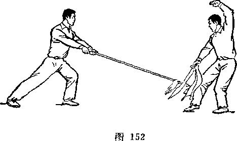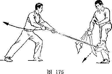 乙重心后移,两腿屈膝;右手向后抽枪,左手滑握枪中 段,枪尖朝前,枪杆平置于腰前,?目视甲(图245)。