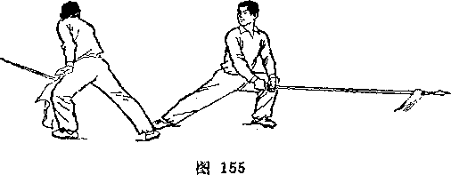 左腿屈膝前弓,?两手握枪,枪尖朝左上方,枪杆斜置于体前;甲乙对视(图276)0