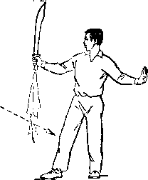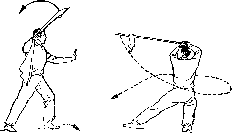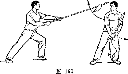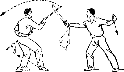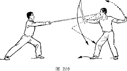 再如对练中刀的劈头动作,既要呈现出刀的勇猛快速的特点, 又要照顾对方低头闪躲时的安全。在刀下劈时,切忌象单练动作 那样立劈直砍,应在刀即将接近对方背部时,右前臂稍外旋,使 刀刃斜向前微翘,随即用刃后的刀身沿着对方背部快速的划弧下 劈。