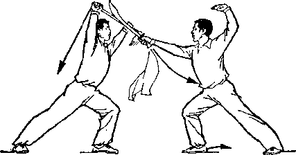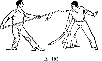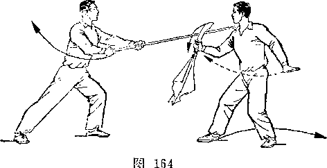 在对练的训练中,除遵循单练的训练方法外,还应加强分解 动作和双方配合动作的训练。分解动作的练习,以提高个人专项 技术水平为主,例如:持枪者可对着树或別的物体练习各种扎枪 动作,掌捏枪扎出后的准确性和稳定性;双方配合动作的练习, 以掌握好进攻与防守动作的时机为重点。如:单刀对枪套路中, 双方可多配合做甲持刀劈头、乙低头闪躲的动作。甲掌握好劈刀 的路线和速度,乙则练习把低头动作完成在甲劈刀将至的一刹那 间。多做这类动作的配合练习,可以逐步掌握对练项目的运动规 律和技术要领,提高动作的质量和套路的演练技巧,有效地防止