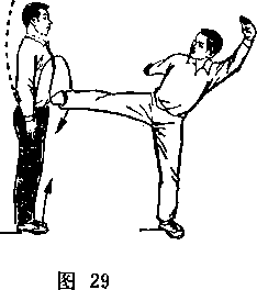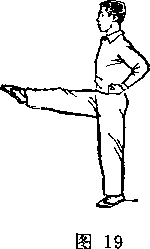 (2)右小腿向前弹踢,脚面绷平,腿伸直,眼看前方(图19)。