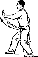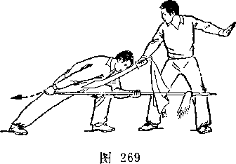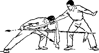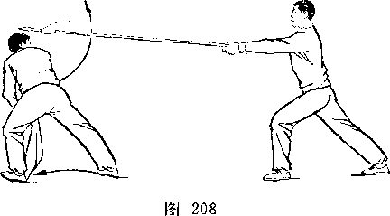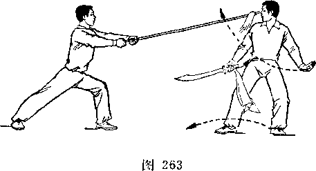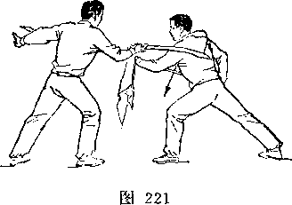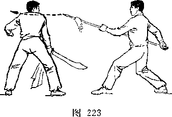 乙左腿屈膝成左弓步;上体前屈,低头闪躲;甲右手握刀继续向左、向下弧形抹至乙体右侧;目视刀(图269)。