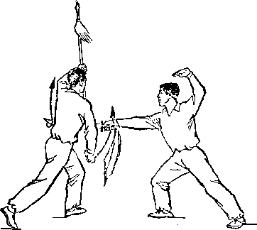 段,枪尖朝前,枪杆平置干腰前;目视甲。甲重心右移,左脚微 后撒,脚尖虚点地面,右手握刀,由下向后、向上划弧举起;刀 尖朝上,刀刃朝后;左掌前平举,掌指向上,?目视乙(图248)。