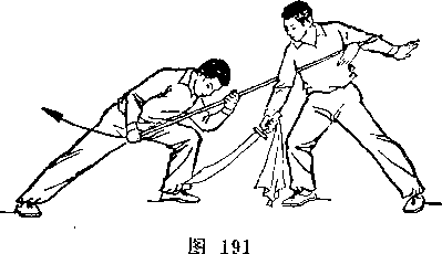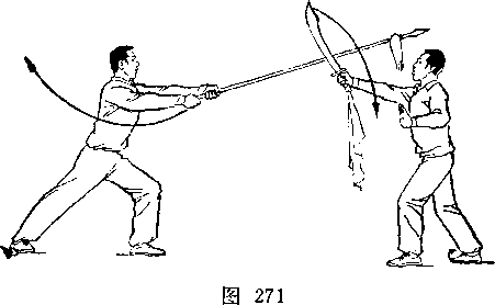 乙两手握枪向前上方扎甲头部右侧。甲右脚后撤一步,上体右转;右手握刀向右上方弧形环挂乙枪,刀尖朝上,刀刃朝前;甲乙对视(图271)。