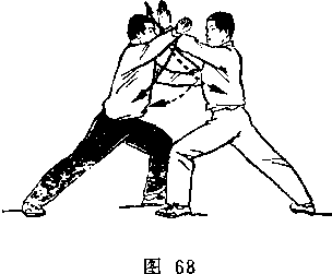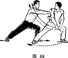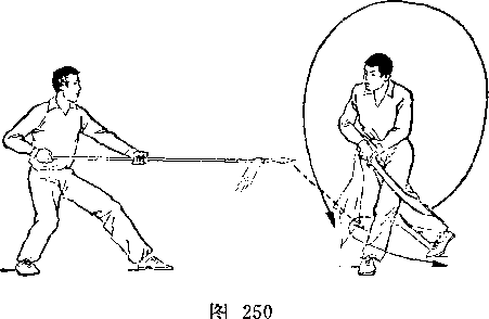 甲左脚于右脚前落地,脚尖外展,两腿交叉微屈。乙重 心后移,两腿微屈,右手向后抽枪;甲乙对图250)。