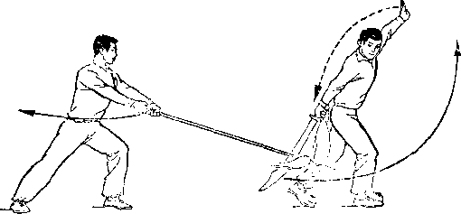 乙重心后移,两腿屈膝;右手握把端后抽,枪尖斜向1二 麵起,枪杆斜置于体右侧;目视甲(图233)。