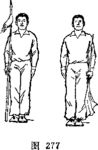 抱刀垂于体左侧;右臂自然下垂,目视前方。乙身体右转,左脚尖内扣,右脚向左脚并拢,左手持枪中段向右下方传送,随即自然下垂于体左侧,?右手持枪置于身体右侧I目视前方(图277)。