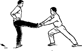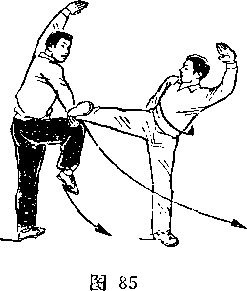 ' (5)甲亮掌侧踹 乙提膝勾挂