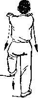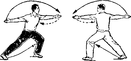 左脚后撤一步,成右弓步, ?同时两掌由两侧弧形上举,到头 前上方时,两掌叠并(右手在下),然后向下拍击,两手位于腰 前;眼向前看(图15)。