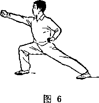 两拳拳心向上抱于腰间;右脚向前一步,成右弓步;右拳向 前冲出,拳眼向上;眼看右拳(图6)。