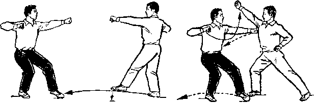 一、 初学时,可用喊口令的办法,使第一动先由一方完成进 攻动作,第二动再由另一方做对付对方这一方法的相应动作。采 用这种方法练习,常会产生双方距离太近、动作伸展不开的感觉。 这是因为套路中双方的动作本来是连接的,攻守、进退是同时进 行的,现在动作分解开来,一方进而另一方不退,就会出现距离 太近的情况,但为了使初学者明确和掌握套路中每一个动作的实 用意义,并使动作合乎技击要求,适于先采用这种方法。