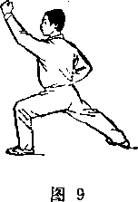 随即左脚向前一步成左弓步,?左拳经上向前反臂砸拳, 拳心向上;眼看左拳(图9)。