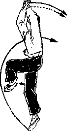 右臂由右上方向右下方弧形抡挂,右手在体右后侧变勾手; 左掌举于头前上方,掌指向右;上体右拧微前倾,?同时右腿屈膝 提起;眼看右前下方(图13)。