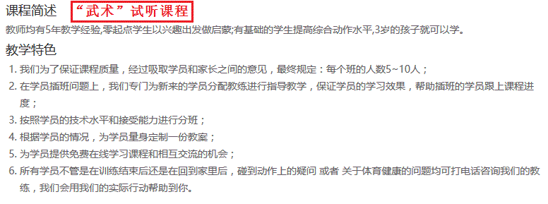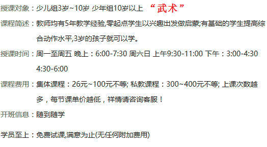 目前在武术世家上的第四节课,这几节课孩子的变化很大,很感谢教练的指导,对孩子很负责任,对比了好几家,最后选择武术世家,试听的第一节课就报名了。非常不错。价格也很合理,练武术就到武术世家。