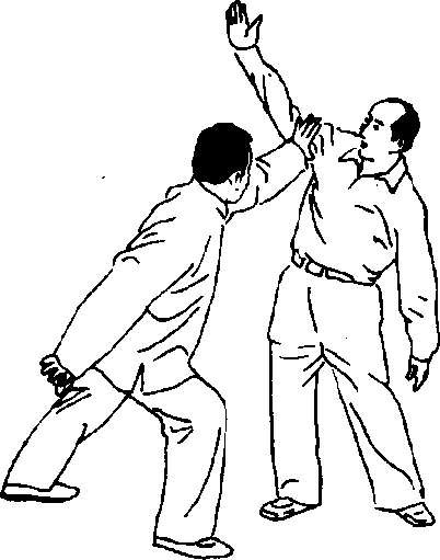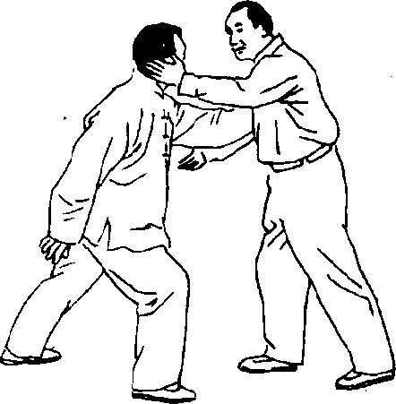 如对方以右手打我嘴巴, 我则以左掌掌心粘其右臂弯 处,对方反以左手打我右嘴巴, 我即以右掌将其左肘托起向左 前上方移动,使手背贴近左耳, 与此同时,左掌粘其右臂向右 后下方移动,使手背帖近右膝 外侧,随之左足向左前方迈进 一步,锁住对方右足,然后,两 臂向左前、右后方分而形成斜 行飞翔之势,这时,对方则应手