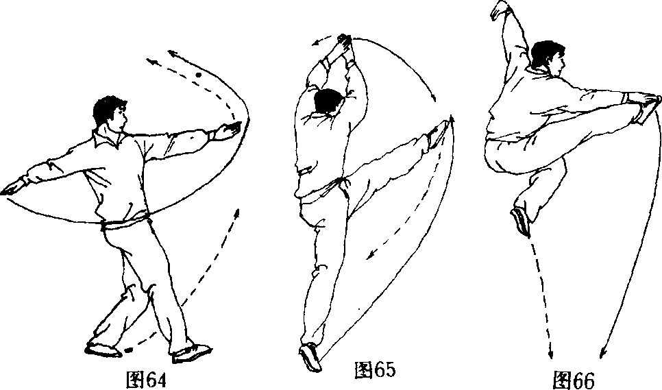 [动作]左脚在体前站立,右脚向前上步,左腿向前高提, 随即右腿起跳,右脚尖绷平向前上方踢出,在空中右掌拍击右 脚面,左手勾手摆至身体左侧斜上方,目视前方(图64、65、 66)。也可以垫步接上步再接腾空飞脚。