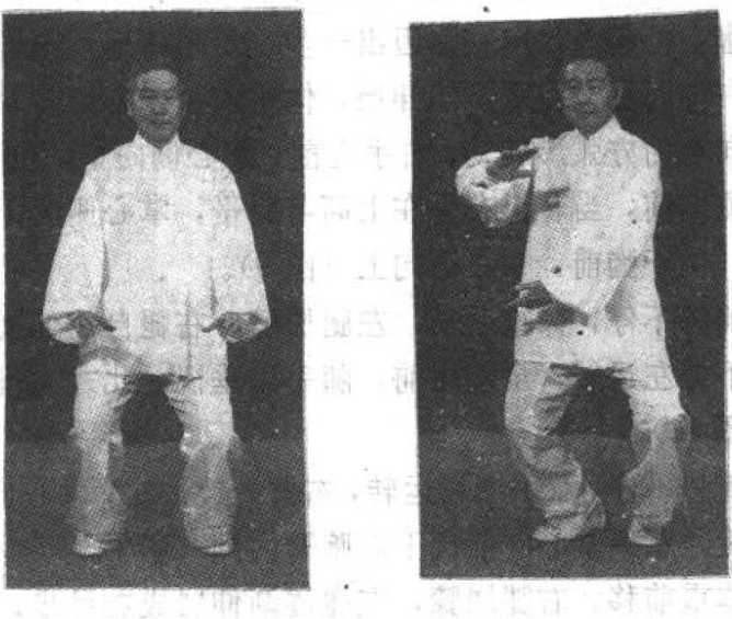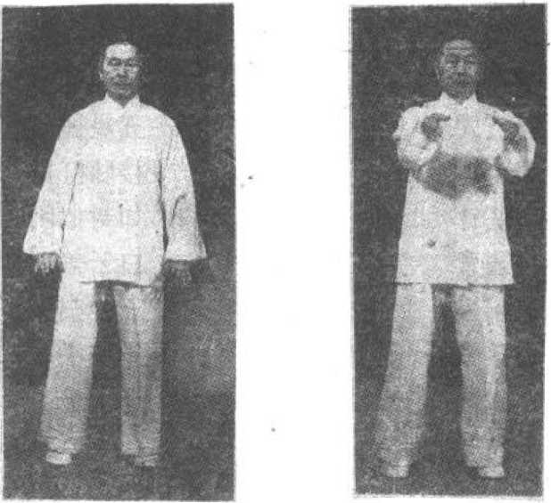 ‘ 自前式两臂外旋,遂即两臂徐徐向胸前提起,高与肩平, 掌心相对,虎口向上,沉肩垂肘,同时体重稍前移,两足掌 着力,十趾抓施;身法以不露外形为准(图5)。