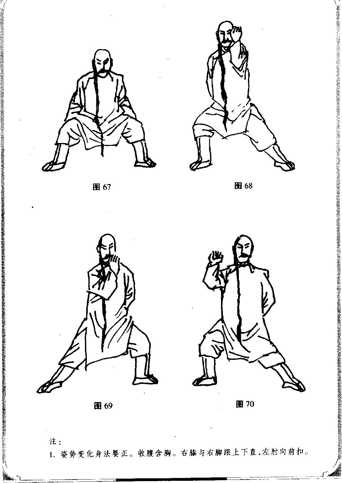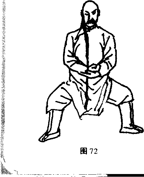 2.宽衣解带势,实为解脱后来人抱腰之式。左拳压腰窝处,用于对方提我 之手臂;.两手绕脚脖则用于提后来人之腿脚。其用法无穷,无非随势所用而