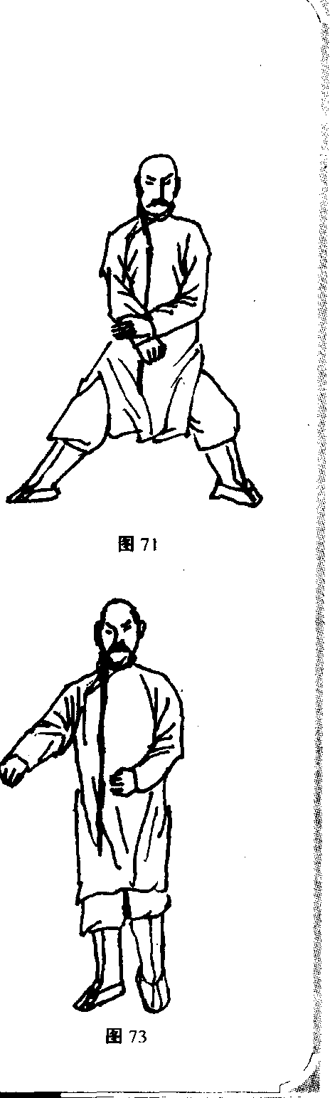 盥. 犍盥. 犍叫叫接上式。右拳从右向下缠绕收 至小腹处,右脚尖随之收回。左拳由 腰窝转向小腹处变掌,左掌切右拳 手脖处;两前臂同时翻转;右拳至左 拿手心直往右侧串出,直至膝下。同 时左掌变拳,左脚跟上一步。此时左 拳、右拳、左脚三者一齐发劲,成右 脚实、左脚虚的丁字步;左脚跟微抬 起,两膝微屈。面向东(图71 ~73)。