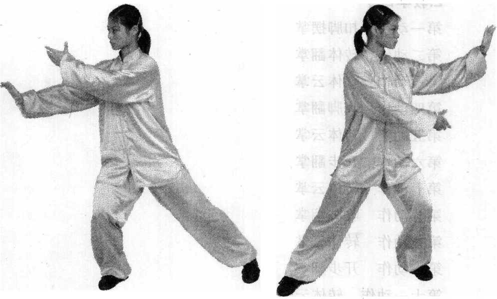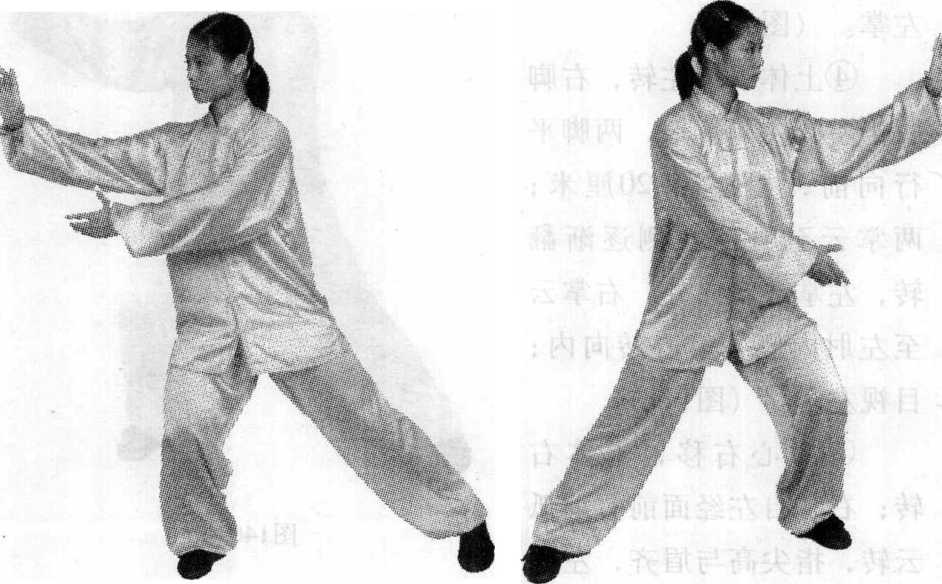 ① 此势动作重心移动幅度大,要 注意运动速度均匀连贯。