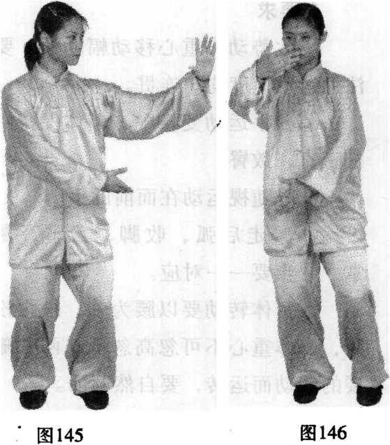 上体继续左转, 右脚收于左脚内侧落 地,两脚平行向前;相 距10~20厘米;两掌云 至身体左侧逐渐翻转, 左掌心转向外,右掌云 至左肘内侧,掌心转向 内;目视左掌。(图145) 上述动作再重复一 次,惟最后收并右脚 时,脚尖内扣约45度落 地。(图 146~图149)