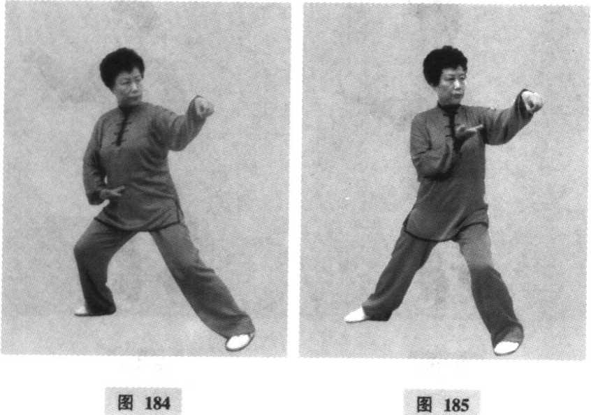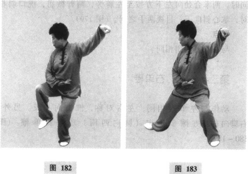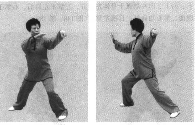 动作与左单鞭相同,左右对称,惟方向相反。另夕卜, 右脚向右前方擦步铲出(胸向西南)成右斜单鞭。(图 180~ 187)图180图180图181图181图180图180图181图181要点同左单鞭势。第二段