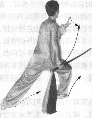 1 .身体右后转身幅度较大,要以腰带腿,左腿重心稳固 后,左脚充分内扣,可用右脚点地辅助进行,轻灵柔和,重心 不可上下起伏。