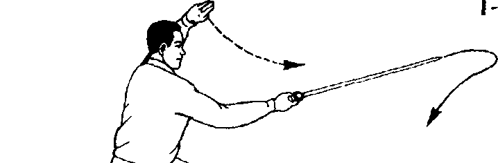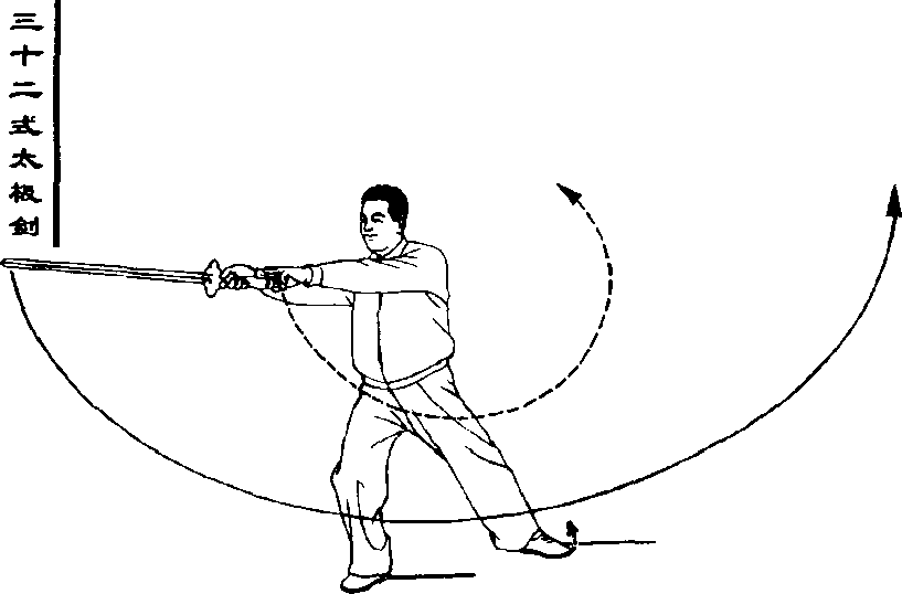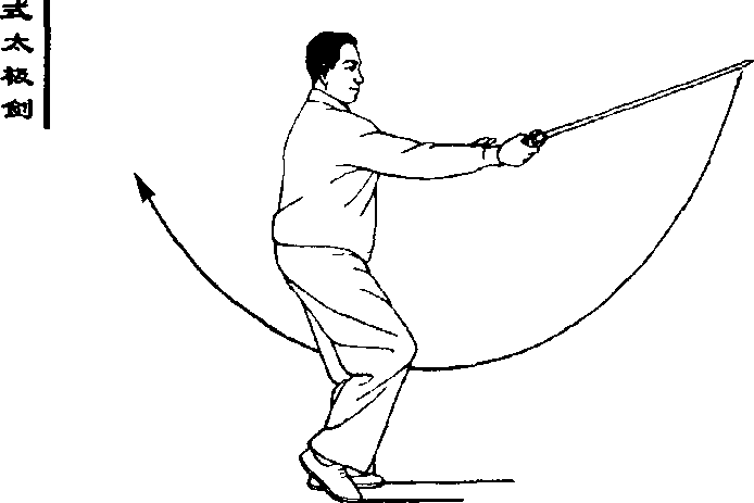 右手剑向前引伸,并慢慢翻掌将 剑向左斜方回带,屈肘,握剑手带至左