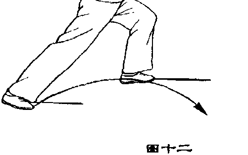①上体右后转,剑随转体向右后 方劈下,右臂与剑平直,左剑指落于右 手腕部;在转体的同时,右膝前弓,左 腿向左横落撤步,膝部伸直;眼看剑尖 (图十一)。