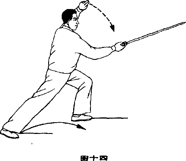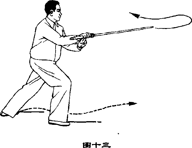 手;左手剑指下落附于右手腕部;眼 看剑尖(图十三)。