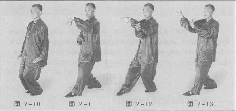 ,同时左臂抬起屈肘,屈腕, 掌指向下拨动,目视左掌动作。(图2-11)