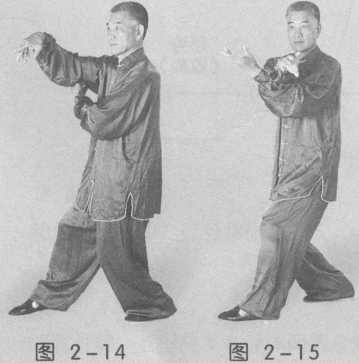 (4)右转身向路线④上右步,同时右臂屈肘,屈腕,掌指向下拨动,目视右 掌动作。(图2-14)
