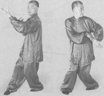 (5 )向路线⑤上左步,同时右掌掌心向下,掌指向前前伸,左臂外旋,掌心向上, 向右肘下穿出,目视掌的动作。(图2-15)
