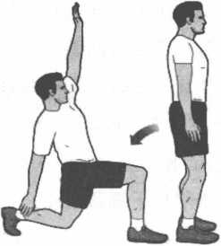 下图演示的是后弓步伸展运动,可以帮助舒展脊椎、放松 膝盖和臀部以加强转体运动能力。具体动作为收臀站直,左脚 向后迈一大步,下蹲成助跑姿势。左手向上升带动身体向右倾 斜,右手去触摸你的左关节。身体向后移动,然后站直,换腿。 左右腿各重复十次。